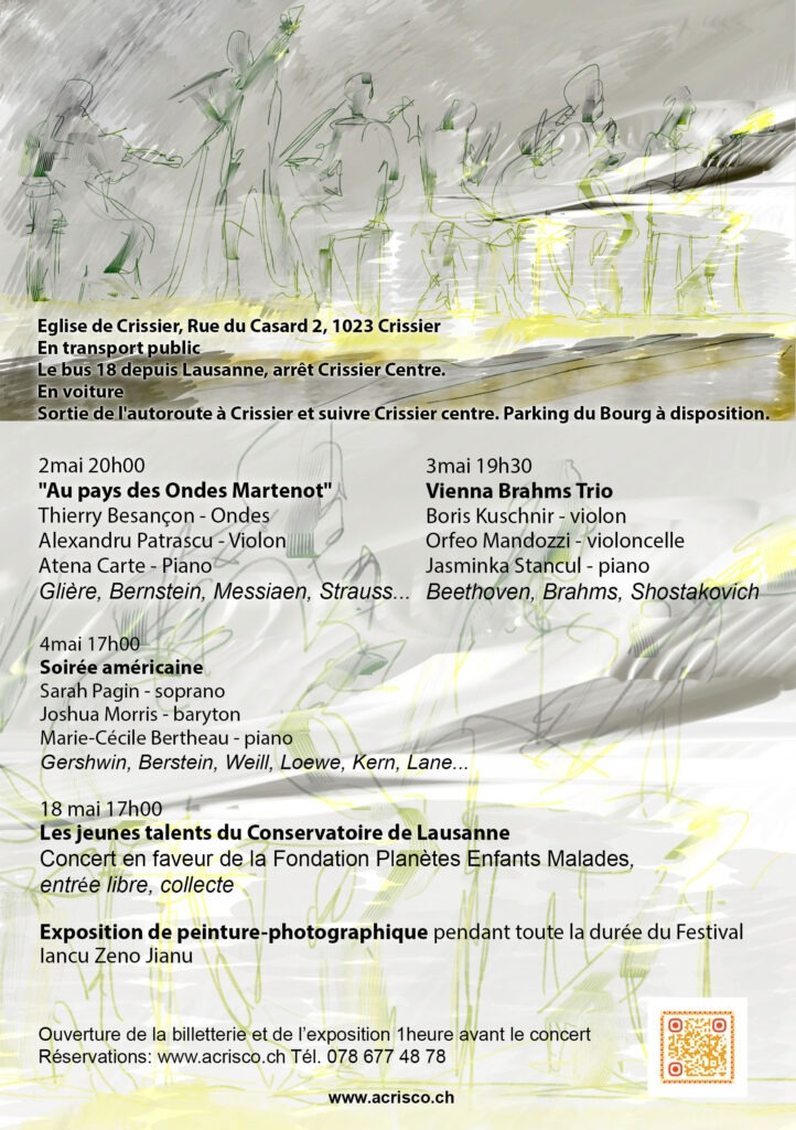 Ces 3 artistes d'exceptions se produisent ensemble tous les 2-3 ans. Leur trio font salle comble dans les plus salles les plus prestigieuses du monde comme le Carnegie Hall à New York. L'association Crissier Arts…